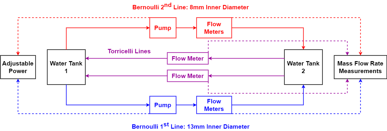 Input: Input elements include the adjustable power source, which regulates the energy supplied to the pumps, and the initial water levels in the tanks, which can be manipulated to set specific experimental conditions. The system allows for control of flow rates through pumps and variations in pipe diameters, enabling exploration of Bernoulli's and Torricelli's principles.